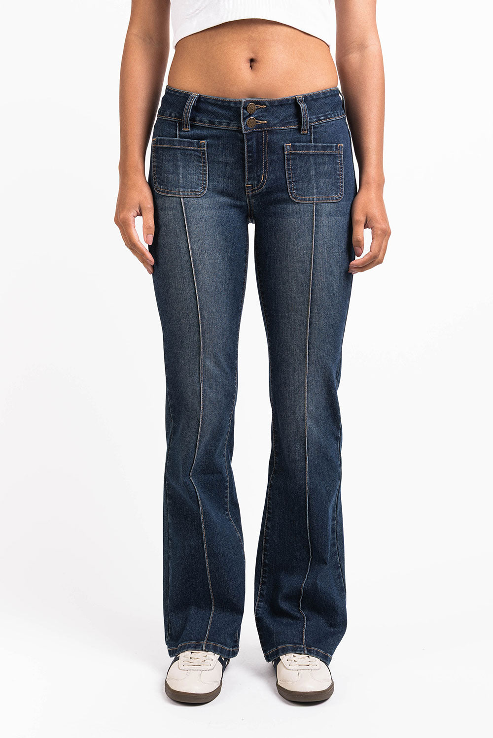 Nämä matalavyötäröiset farkut ovat ajaton bootcut-malli, jossa on toiminnalliset taka- ja etutaskut. Hienovaraiset prässäykset, vyölenkit ja vetoketjusepalus tuovat rakennetta, tehden farkuista käytännöllisen valinnan jokapäiväiseen käyttöön.