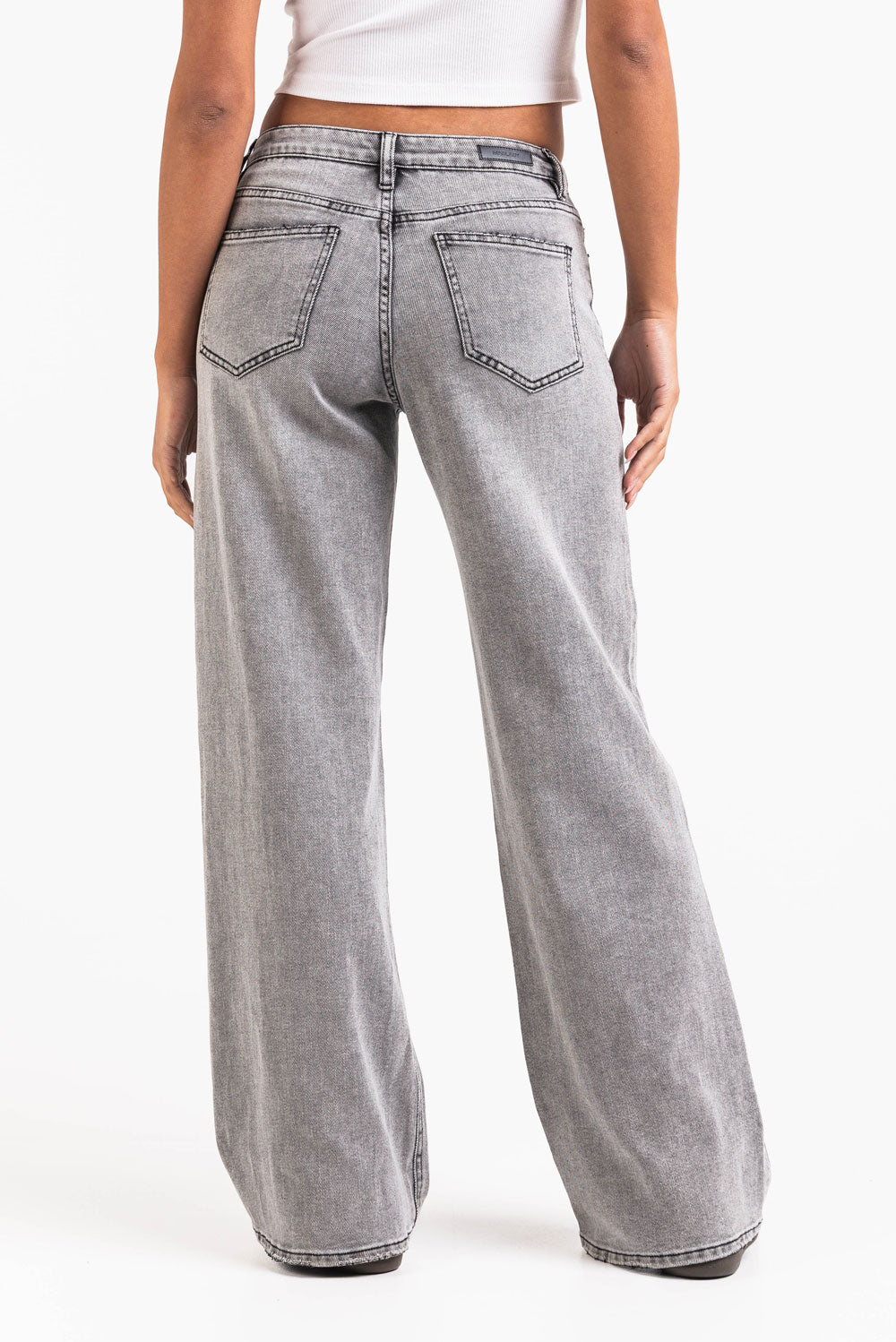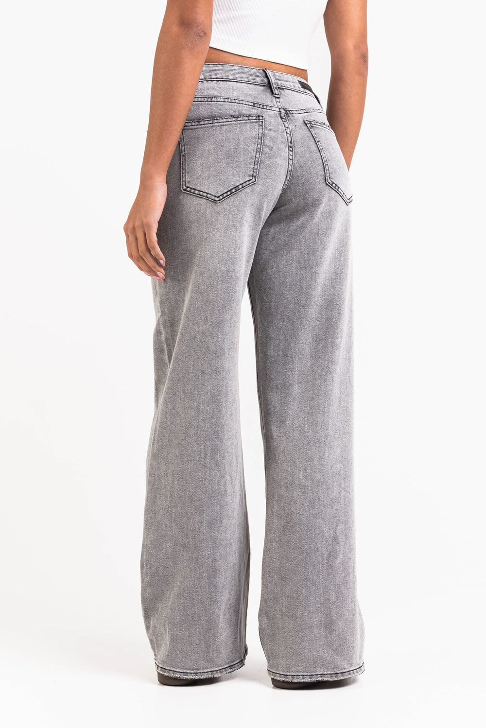 Mid waist -farkut leveillä lahkeilla sekä etu- ja takataskuilla. Vyölenkit sopivat sekä kapeammille että leveämmille vyöille. Housut suljetaan vetoketjulla ja napilla.