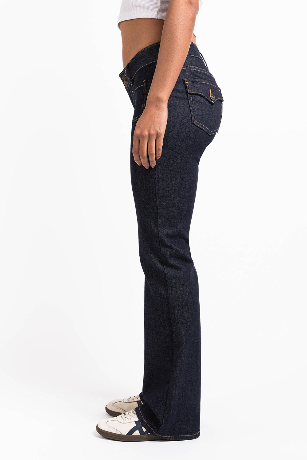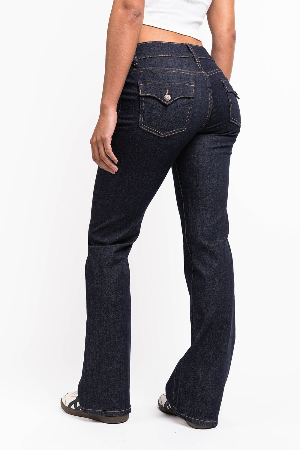 Low waist jeans featuring a flared leg and front pockets and back pockets with flap and button. Generous belt loops to hold a thinner as well as a thicker belt. The pants close with double buttons and a zip.