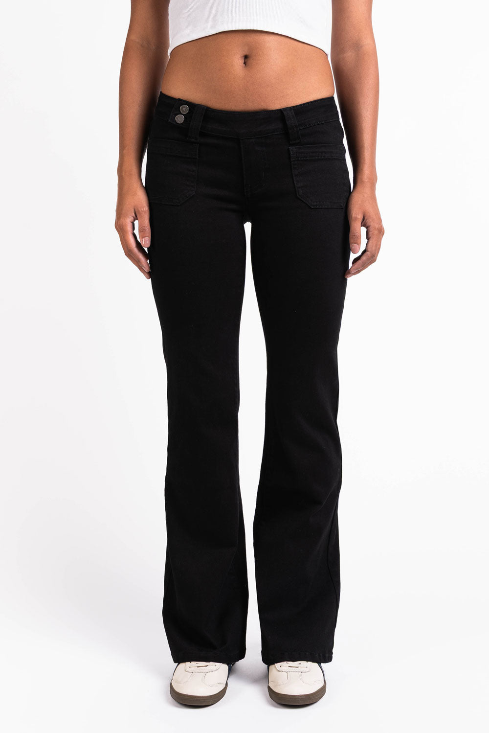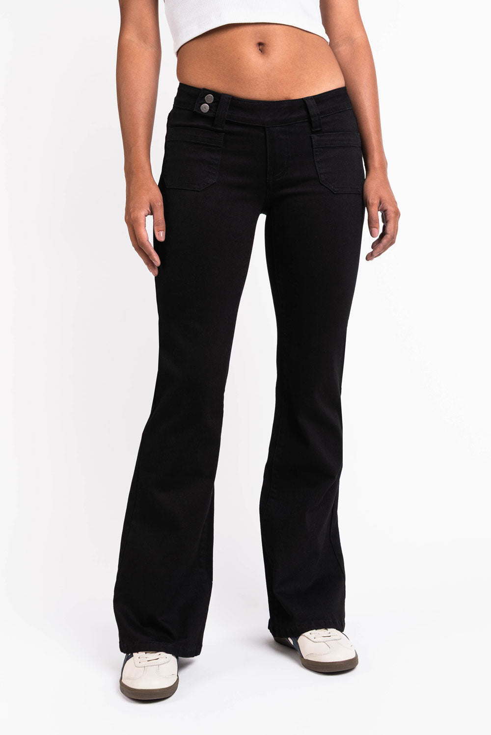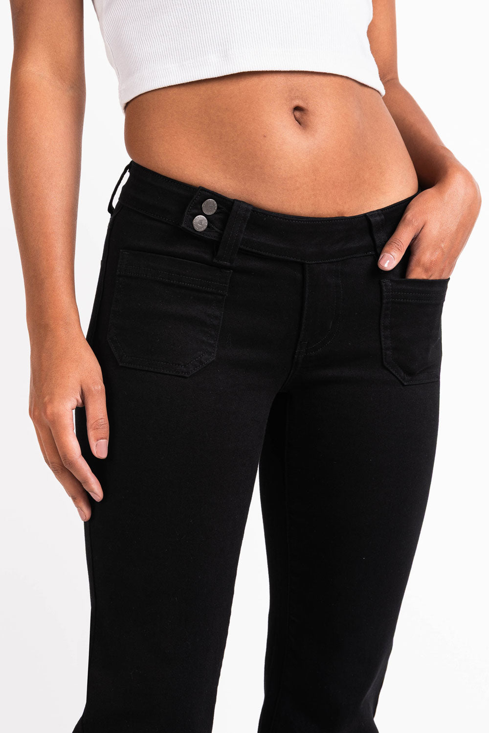 Nämä erittäin matalavyötäröiset farkut ovat bootcut-mallia ja niissä on takki- ja etutaskut käytännölliseen arkikäyttöön. Reilut vyölenkit sopivat sekä kapeille että leveille vöille. Housut suljetaan vetoketjulla ja koristeellisesti siirrottuja nappeja käyttäen tyylikkään yksityiskohdan luomiseksi.