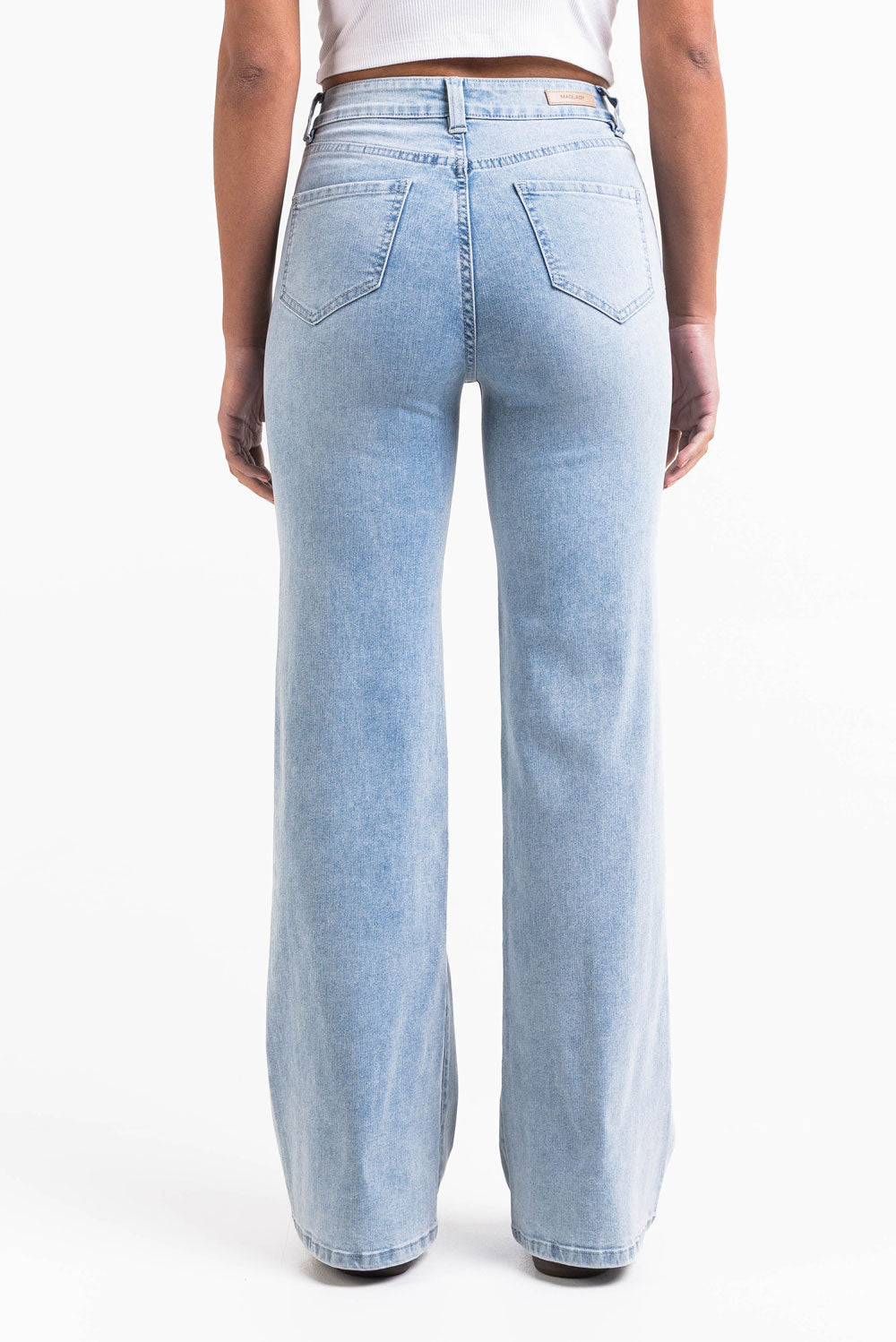 High-waisted jeans with flared legs and front and back pockets. The jeans fasten with a zipper and button and feature belt loops that fit both wide and narrow belts.