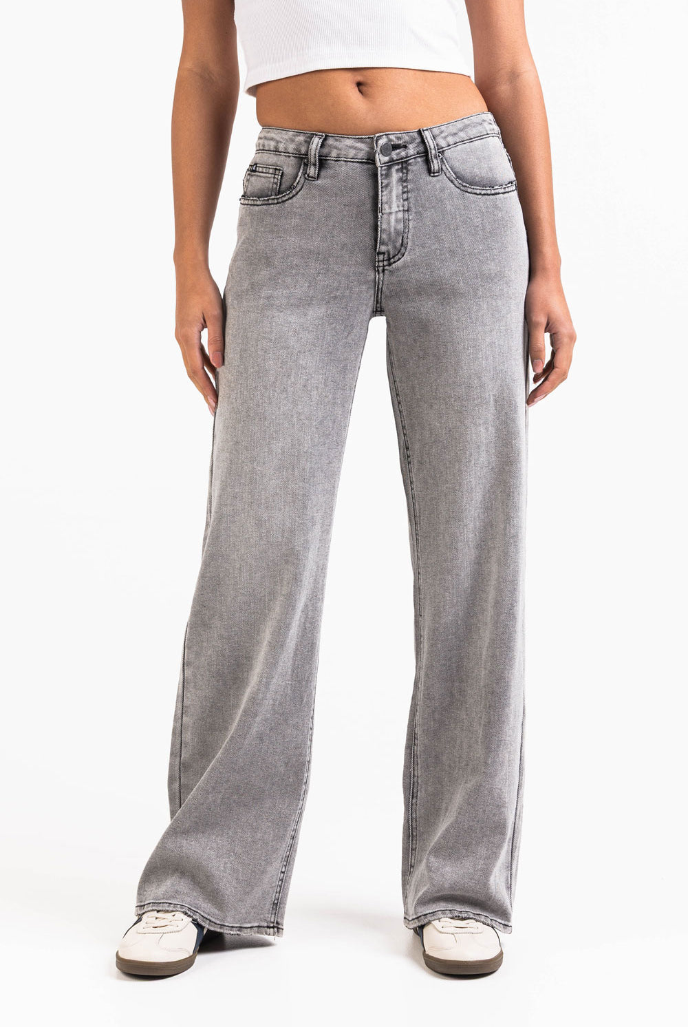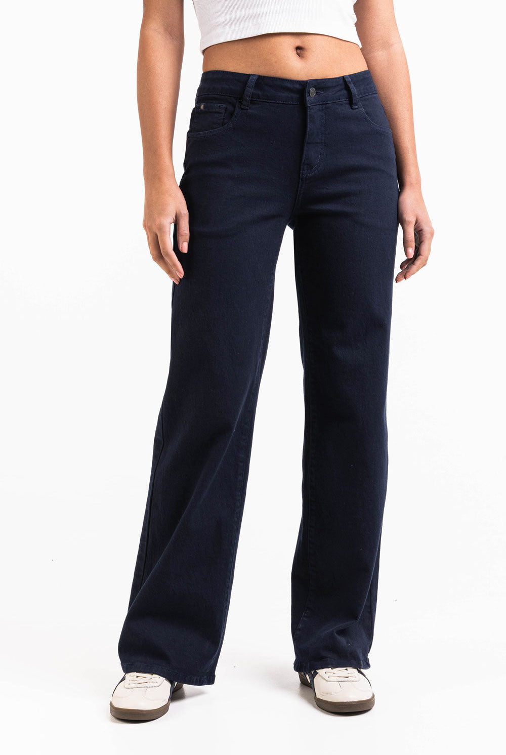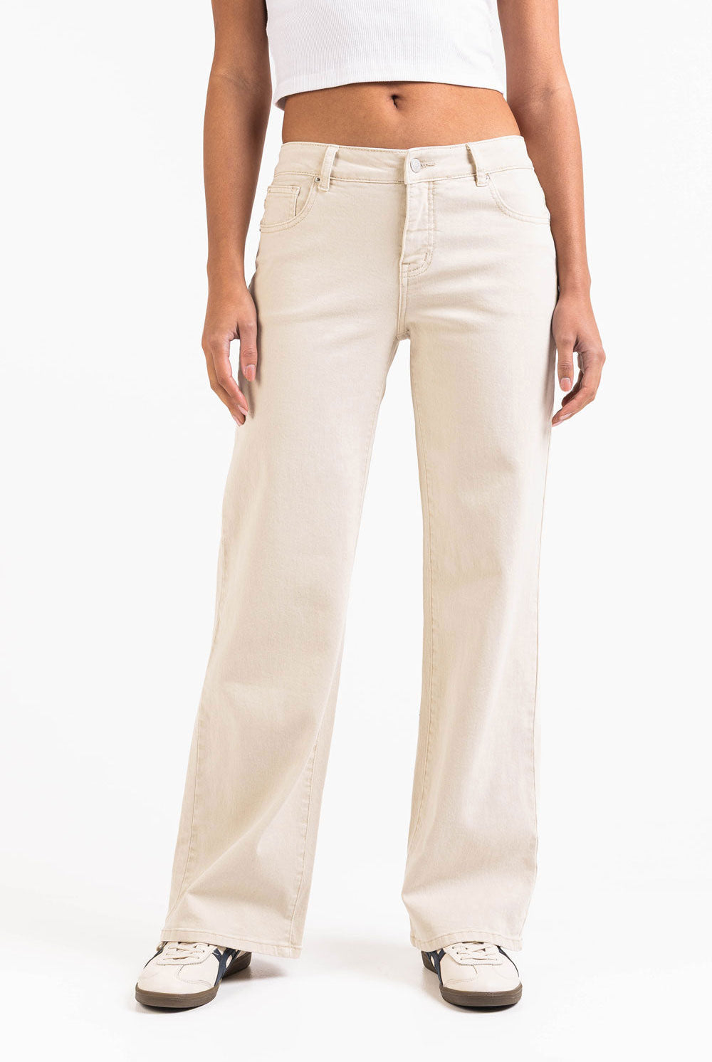 These high-waist pants offer a relaxed straight-leg fit with practical side pockets. An elastic waistband and a fake fly provide comfort, making them a versatile and easy-to-wear option for everyday outfits.