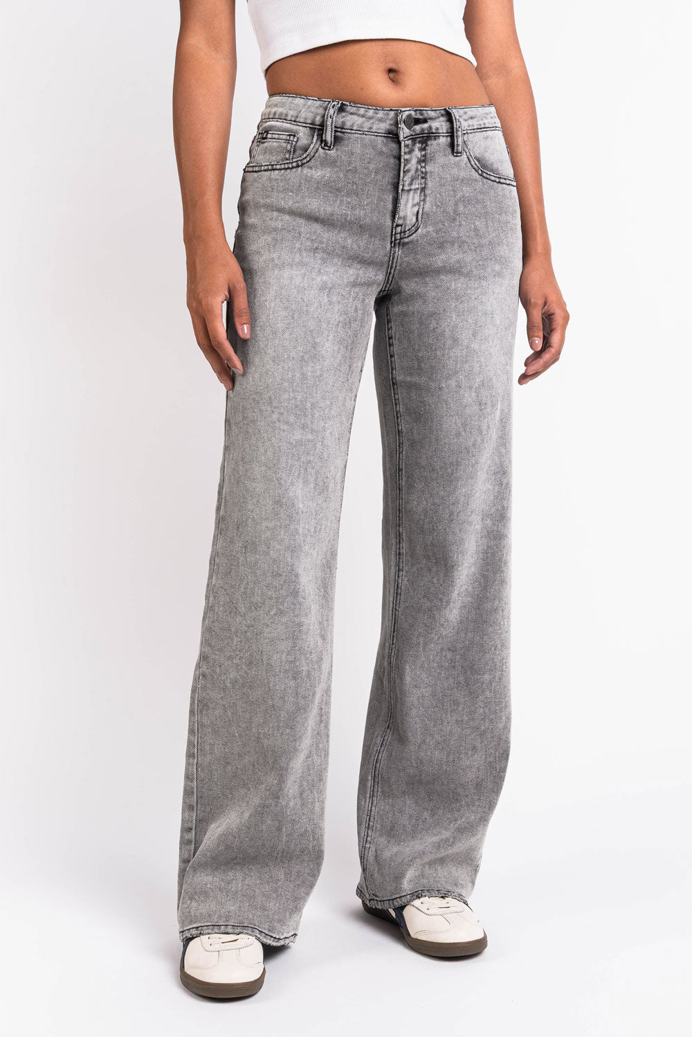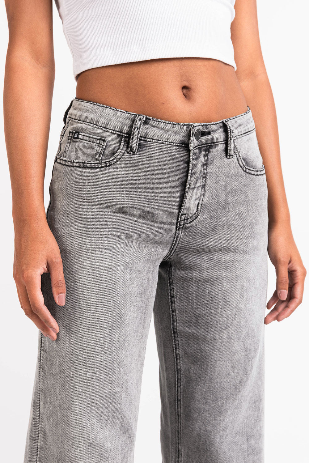 Mid waisted jeans with wide legs and pockets in the front and back. Belt loops that fit both thinner as well as a thicker belt. The pants close with a zipper and button.