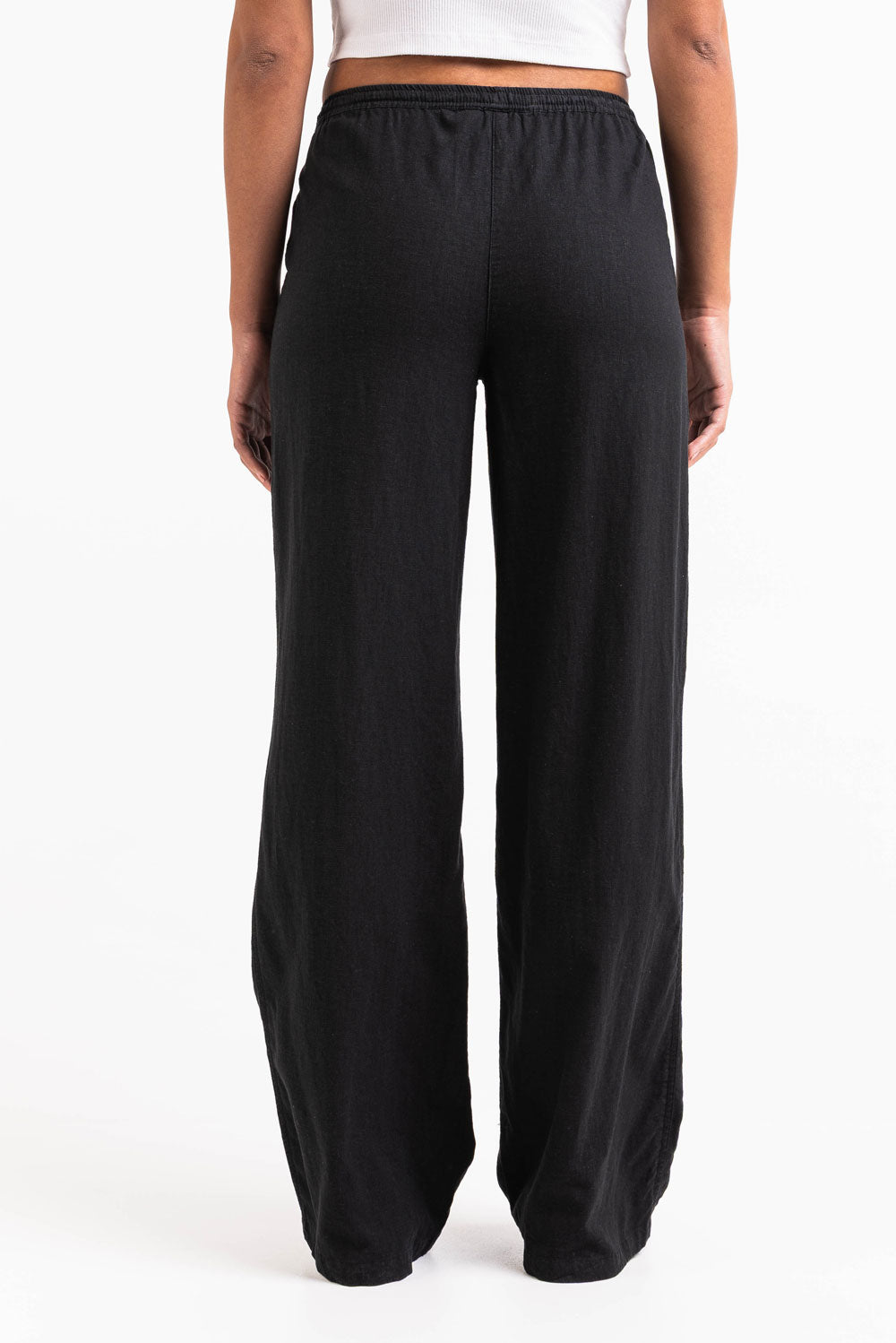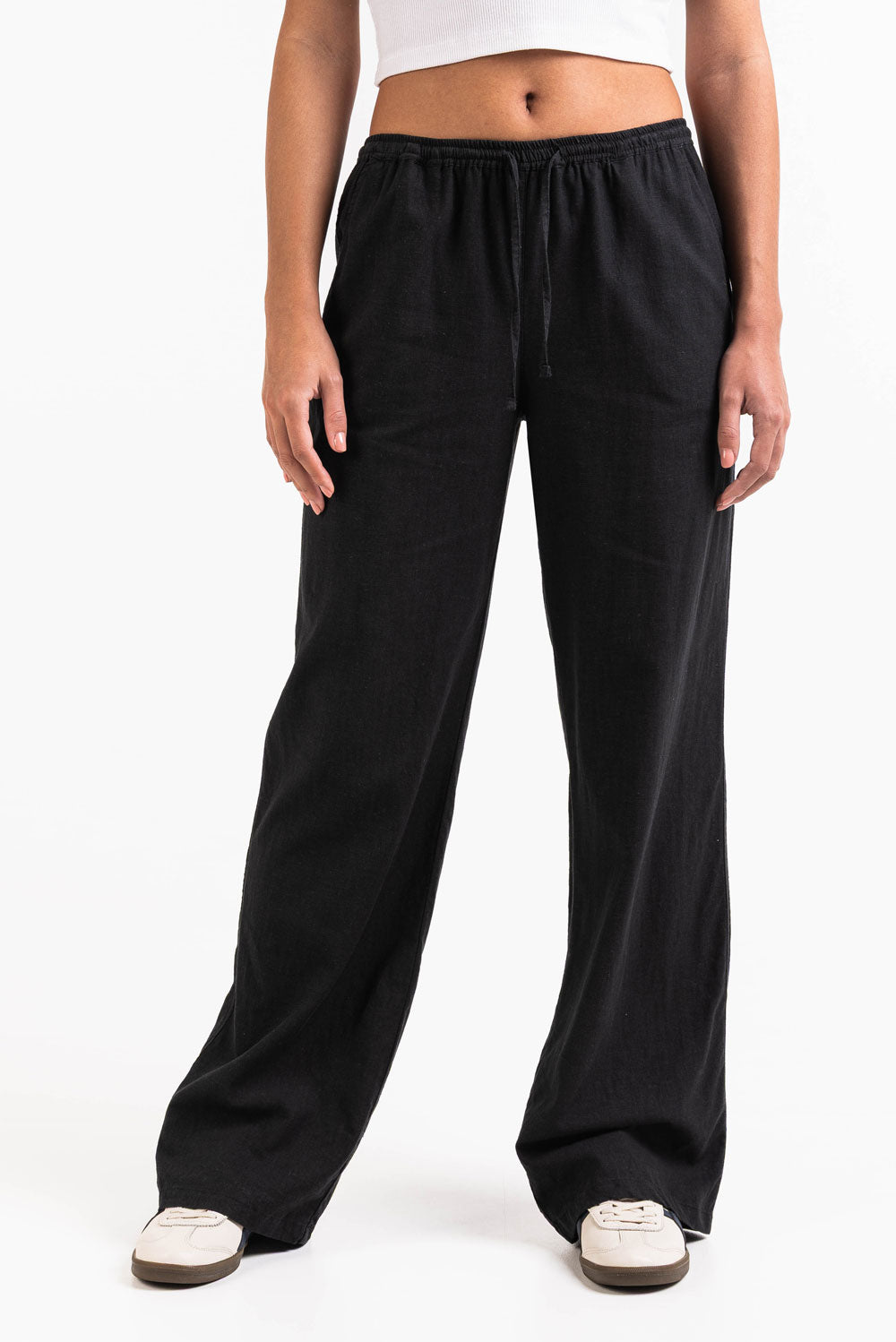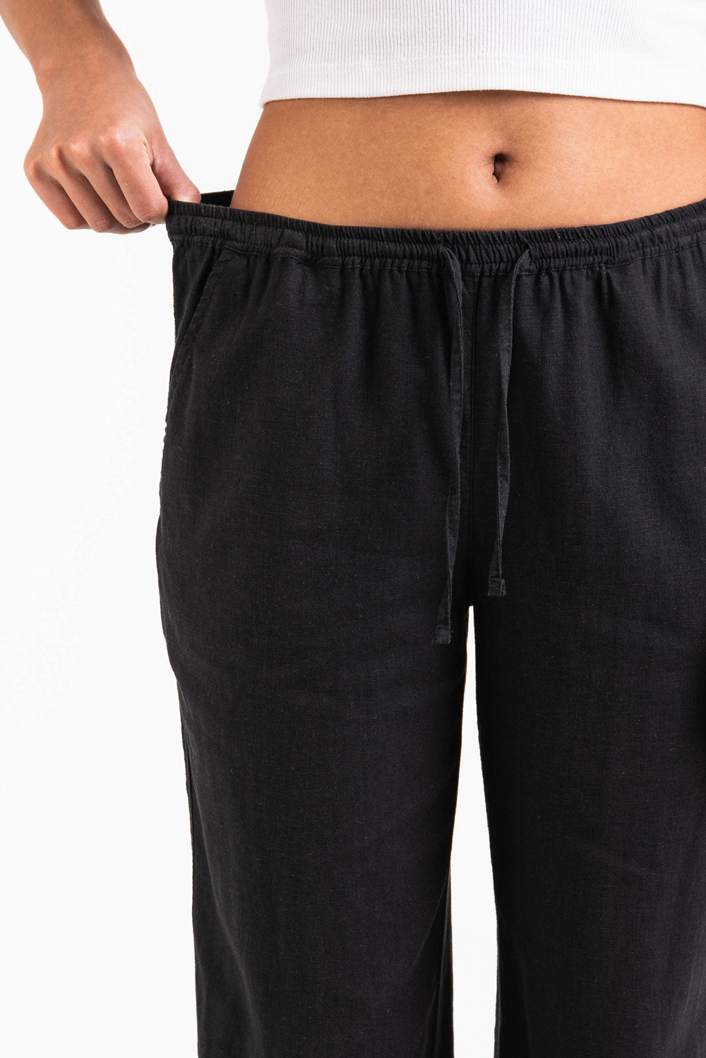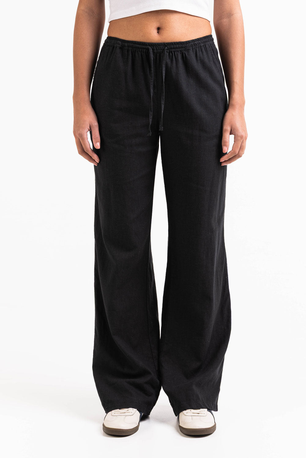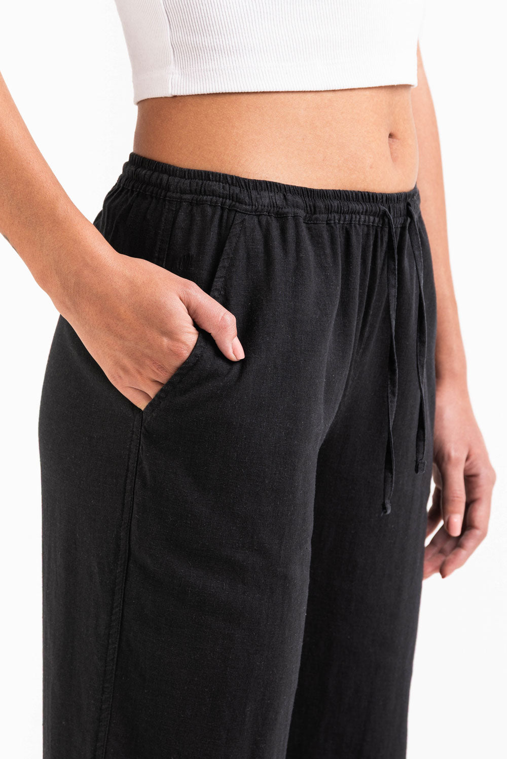 Nämä keski-vyötäröiset pellavahousut tarjoavat rennon suoralinjaisen istuvuuden ja käytännölliset sivutaskut. Joustava vyötärö, kiristysnyöri ja taitettava muotoilu varmistavat napakan istuvuuden pitäen housut kevyinä ja hengittävinä.