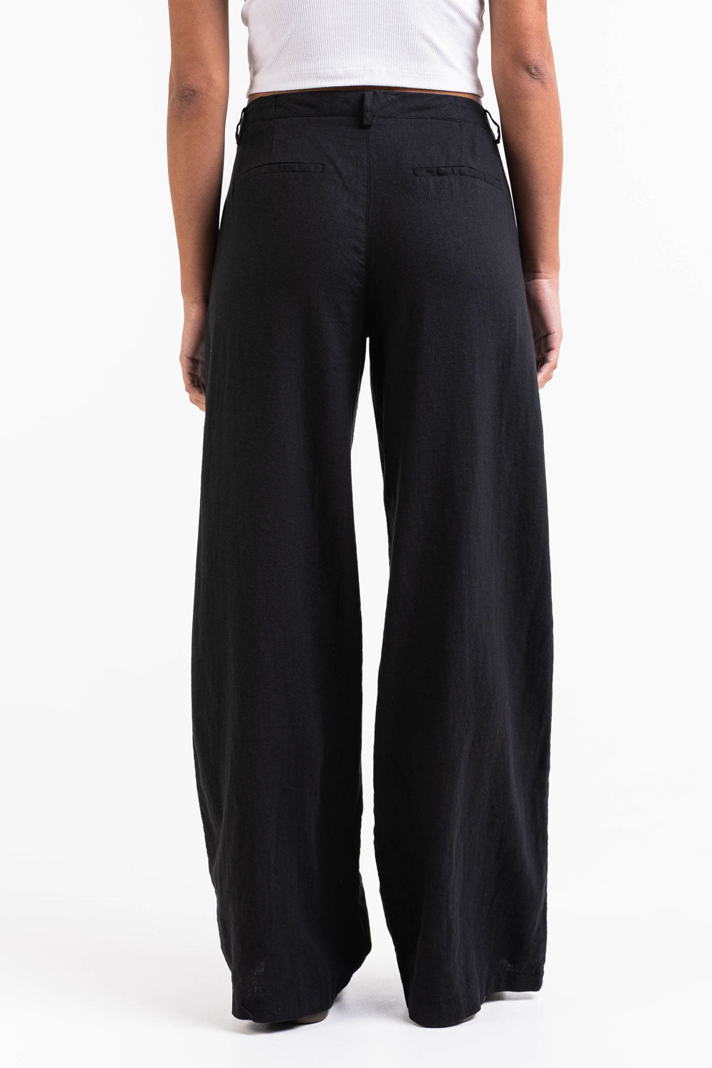 Keskitriseiset pellavahousut, joissa on leveät lahkeet ja rento istuvuus. Sivutaskut, valetakataskut ja vyölenkit, jotka sopivat sekä kapeille että leveille vöille. Housut suljetaan vetoketjulla, hakasella ja piilotetulla napilla.